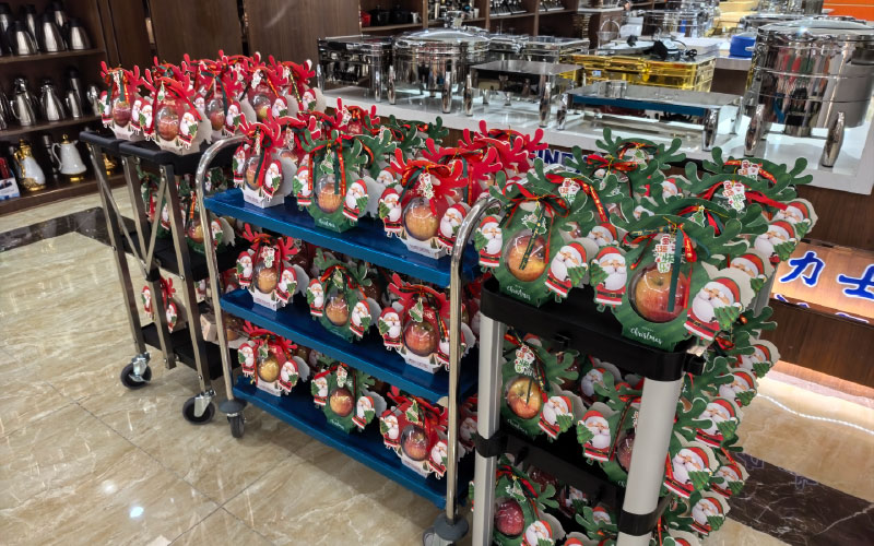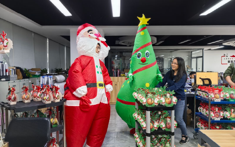 သီချင်းတစ်ပုဒ်သီဆိုပြီး “ပျော်ရွှင်ဖွယ်ရာ ခရစ္စမတ်ဖြစ်ပါစေ၊ ပျော်ရွှင်ဖွယ်ရာ ခရစ္စမတ်ဖြစ်ပါစေလို့ ဆုတောင်းပါတယ်….” လို့ အဓိပ္ပါယ်ရတဲ့ ချစ်စရာကောင်းတဲ့ ပန်းသီးနီကြီးကို ထုပ်ပိုးထားပါတယ်။ ငြိမ်းချမ်းရေး၊ ပြီးတော့ ငါတို့ရဲ့ Santa Claus က ဝန်ထမ်းတစ်ယောက်ကို ငြိမ်းချမ်းတဲ့ ပန်းသီးနှစ်လုံး ပို့ပေးတယ်။ ပျော်ရွှင်မှုနှစ်ဆ၊ အိုး၊ မိသားစုကြီးလို ချိုမြိန်တယ်။